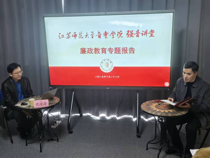 10月28日下午,音乐学院“强音讲堂”第一讲暨2025年度科职干部第三次集中培训,在学院“红乐章”党建工作空间举行。校纪委沈道海副书记,应邀为学院领导班子、科职干部及青年教师开展了题为“严守纪律规矩 优化育人环境”的专题讲座。学院党委书记高小平主持培训。