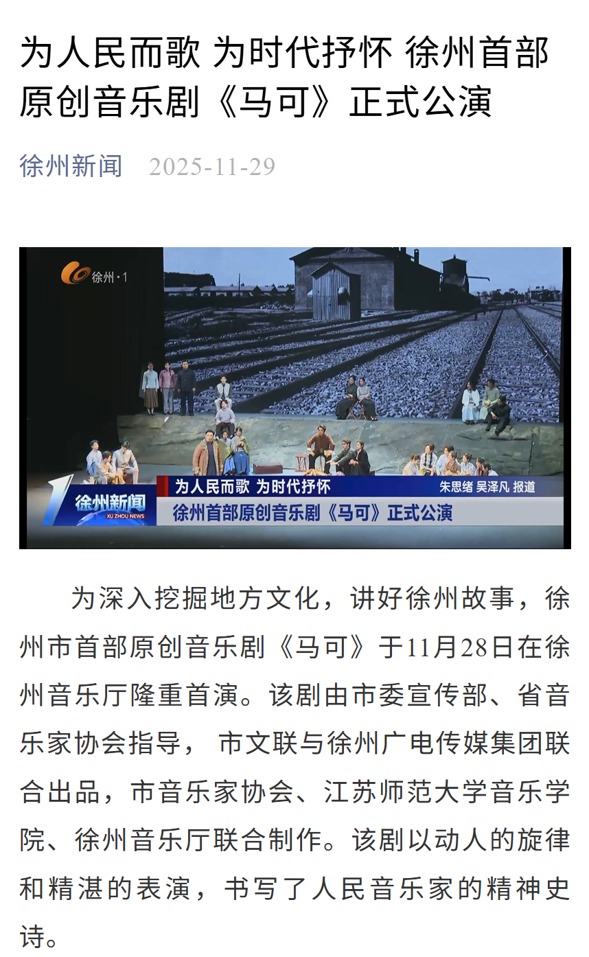由徐州市委宣传部、江苏省音乐家协会指导,徐州市文学艺术界联合会、徐州广电传媒集团联合主办,徐州市音乐家协会、江苏师范大学音乐学院、徐州音乐厅承办的徐州市首部原创音乐剧《马可》,于11月28日在徐州音乐厅成功首演。这既是城市文化自信的全新表达,更是致敬人民音乐家的时代礼赞。
