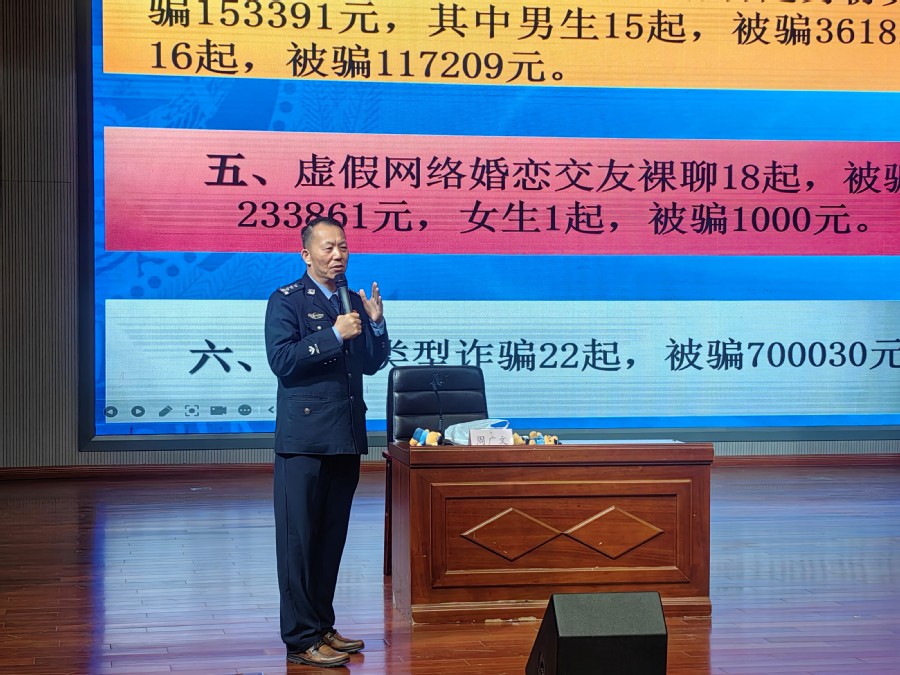 讲座伊始,周警官从电信网络诈骗的内涵、发展过程、常见类型、识别防范的技巧等方面层层剖析,结合当前高发的网络诈骗典型案例,特别是针对高校师生群体的诈骗手法,如“虚假购物交易”“兼职刷单”“网络游戏”“冒充同学、朋友”“虚假网络婚恋交友”等,进行了深入浅出、生动形象地讲解。利用PPT演示、短视频播放等形式,详细揭示了诈骗分子的作案套路、话术特点以及受害者心理,让在场师生对诈骗行为的隐蔽性和危害性有了更直观、更深刻的认识。