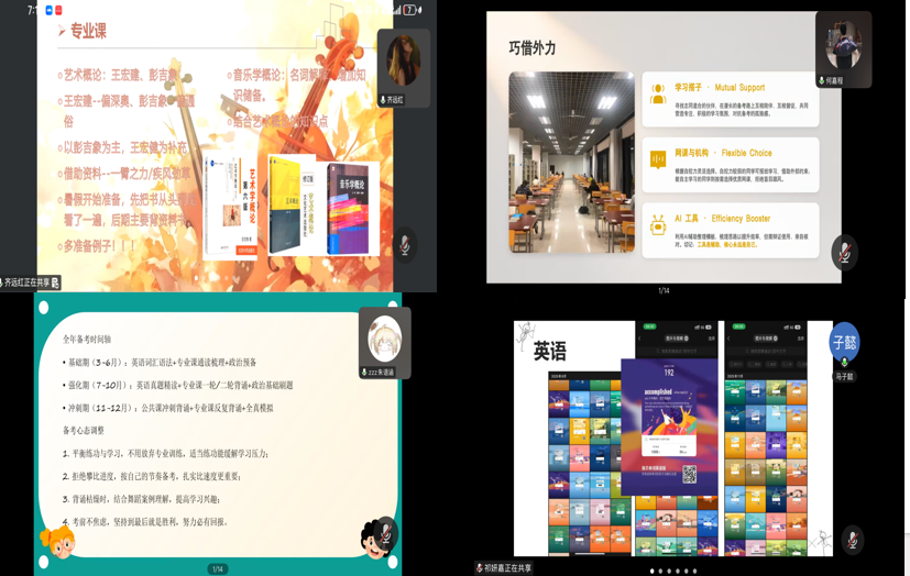 为深入落实立德树人根本任务,提振学子考研斗志、厚植奋发向上的优良学风,4月13日,音乐学院在线上召开考研经验分享交流会。会议由院学生会学创部部门负责人祁妍嘉主持,就业辅导员王艺璇老师参会,学院2023级本科生齐聚云端、共学共进。